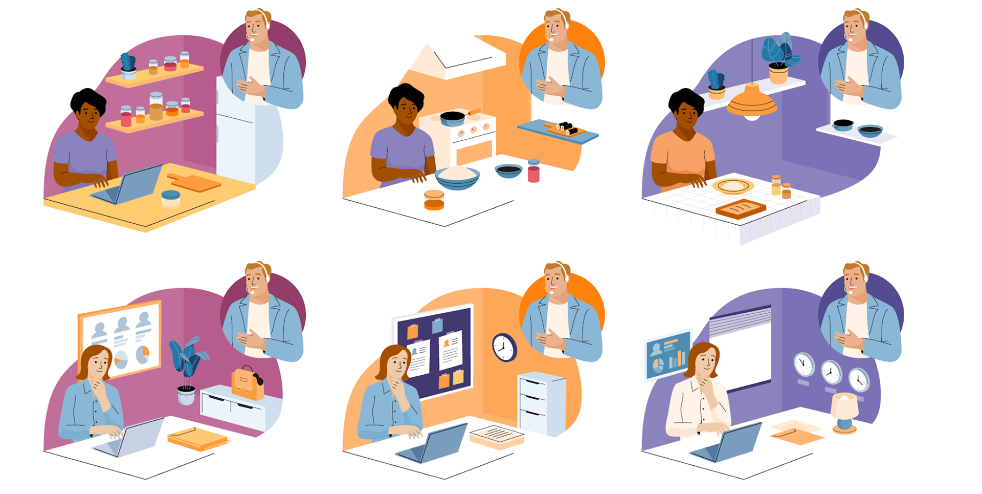 The foundation of the Software Advice illustration system was built through close collaboration—starting with early concepting alongside Cami Dobrin and moving into development with Gustavo Bouyrie. Once we cracked the compositional formula that could flex across a wide range of subject matter, we began growing the library of elements: people, lamps, plants—everything needed to build out scenes with modular storytelling potential. Each composition was designed so individual parts could be swapped to tell entirely new stories with ease.