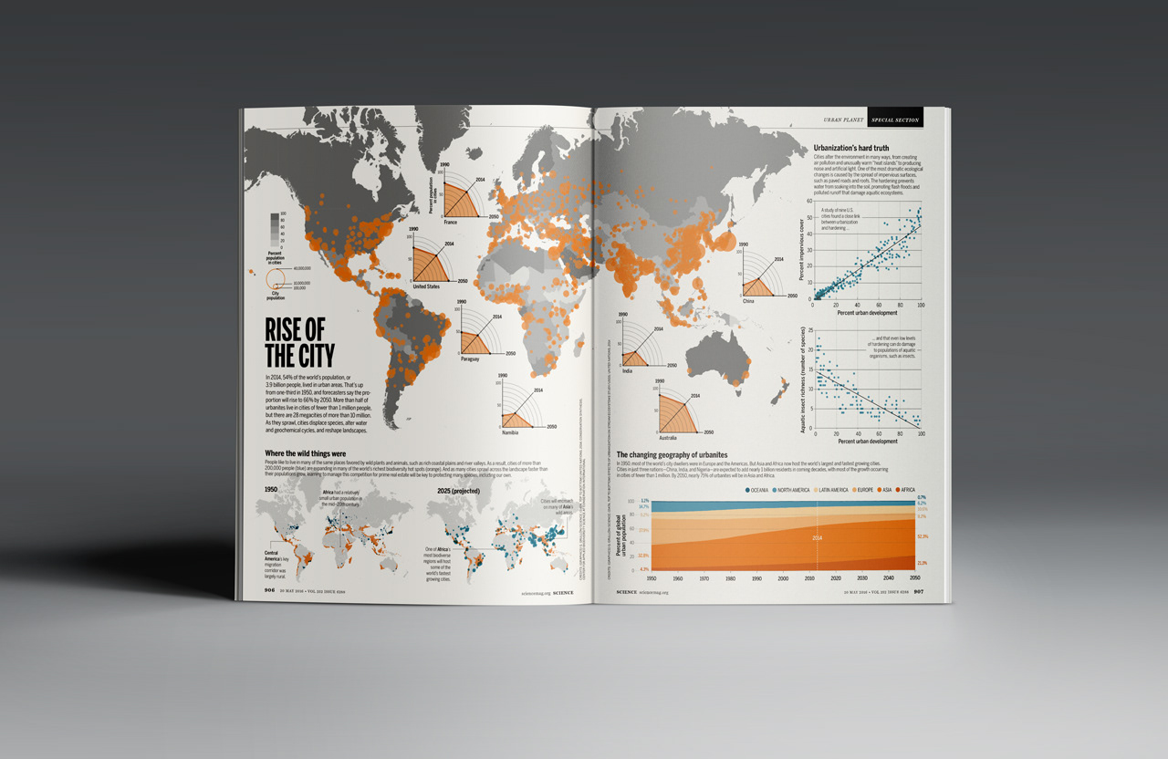 This spread served as the Intro page to a much deeper dive into how modern cities affect biodiversity in a Science special section called "Urban Planet".